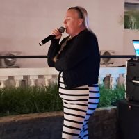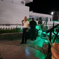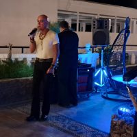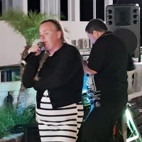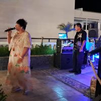 OMG. Yes, it was blowing a gale. We all soldiered on to have a fantastic night in Pefki. The Coralli was a little short on guests. However, we managed to get some fabulous singers—cool people, as usual. I had to Gaff down my laptop. Lower my speaker stands. Hot-glue gun my Pineapple juice to the table. Then we had to secure Mini with guide ropes.